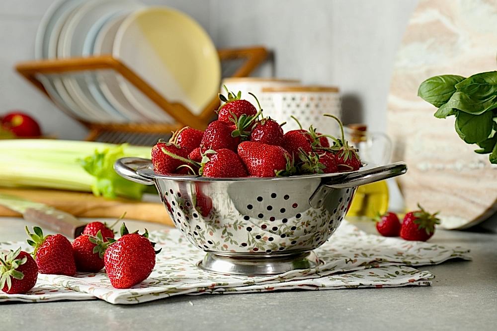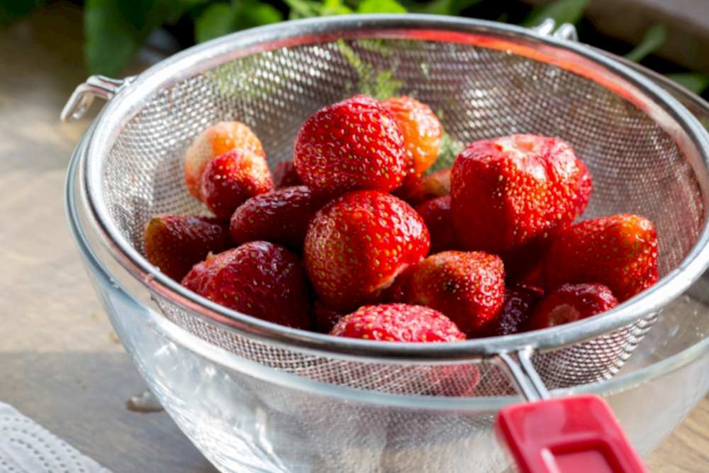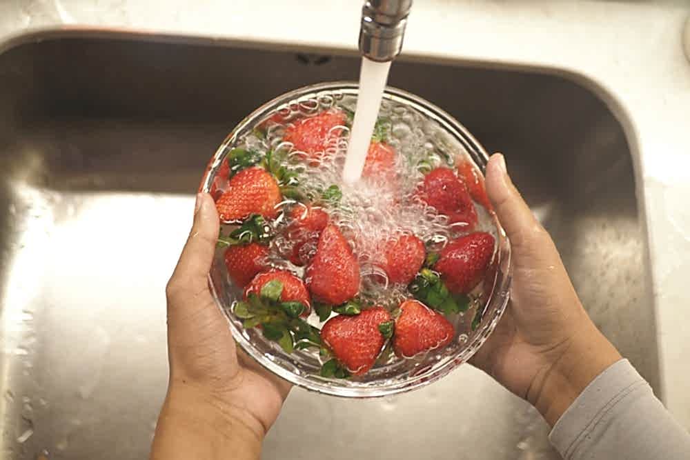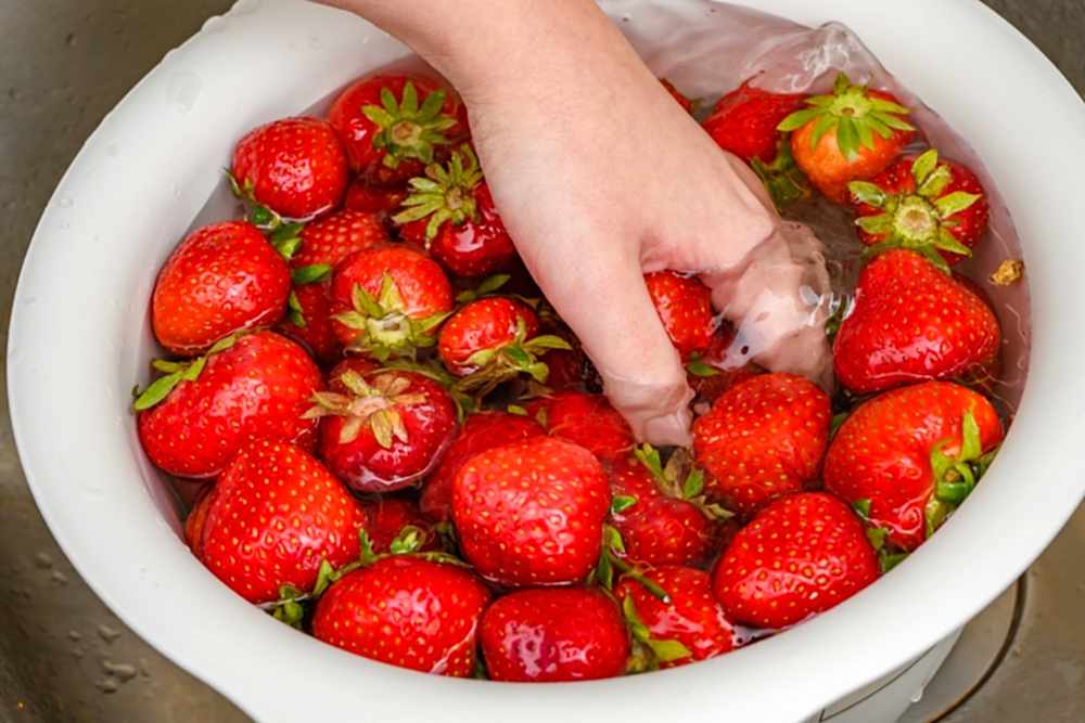 Bekleme süresi dolduktan sonra meyveleri kaptan çıkararak temiz su altında nazikçe durulayabilirsiniz. Bu aşamada sert hareketlerden kaçınmak önemlidir. Çilek hassas bir meyvedir ve kolayca ezilebilir.