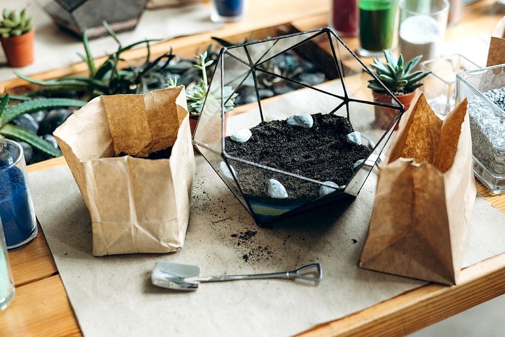 Sonrasında uygun toprak katmanı eklenir ve bitkilerin yerleştirileceği alan hazırlanır. Bitkiler dikkatli şekilde yerleştirildikten sonra kökleri toprakla kapatılır ve hafifçe sabitlenir. Tasarım aşamasında dekoratif objeler kullanılarak estetik görünüm artırılabilir.
